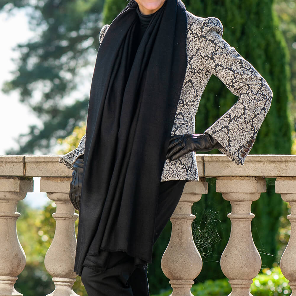 Classic jet black cashmere shawl made from finest hand-spun and hand-woven cashmere. A wardrobe essential it is a versatile accessory and marries effortlessly to neutrals as well as brights.
