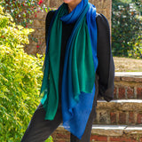 Rich vibrant jewel tones of this emerald to sapphire cashmere and silk wrap dispel the myth that blue and green should never be seen! The effortless shading from a emerald green through to sapphire blue gives this striking wrap impact. . The perfect weight as a year round accessory it is expertly crafted from a clever blend of cashmere and silk. Soft to the touch, light and warm and it drapes elegantly. Generously sized at 200 x 70cm