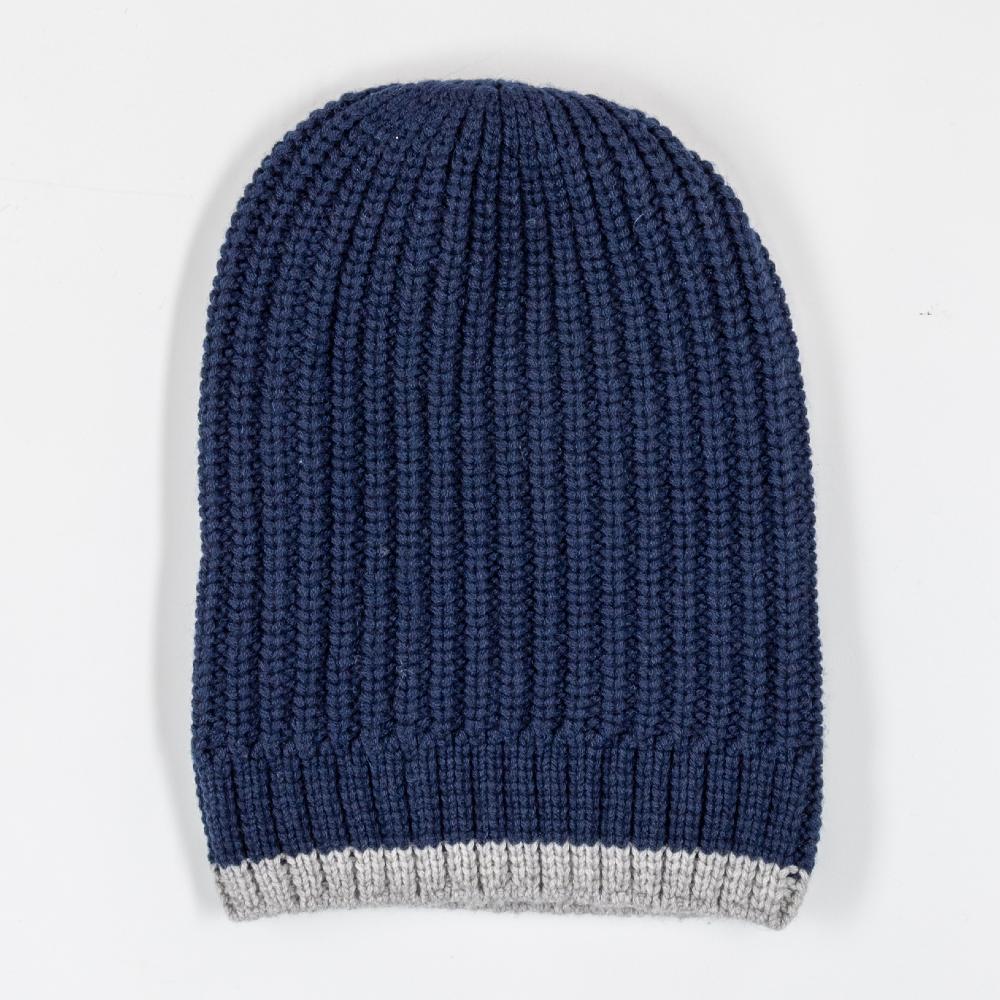 This thick rib knit chunky navy blue and grey cashmere slouchy beanie hat is guaranteed to fend off the cold when the temperature plummets. Made in Italy from the best 100% pure cashmere it is ultra thick, warm and luxuriously soft. This substantial slouch beanie has a light grey rib knit 2cm band which contrasts well with the navy. It is 30cm long ensuring a generous slouch.