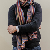 This season sees the return of this multi striped silk and wool scarf, a perennial customer favourite and a versatile accessory. The diagonal weave adds texture and depth to the scarf. Crafted from a fine blend of silk and wool it is soft to the touch, light and warm and generously sized. The short fringing gives it a polished finishing touch.