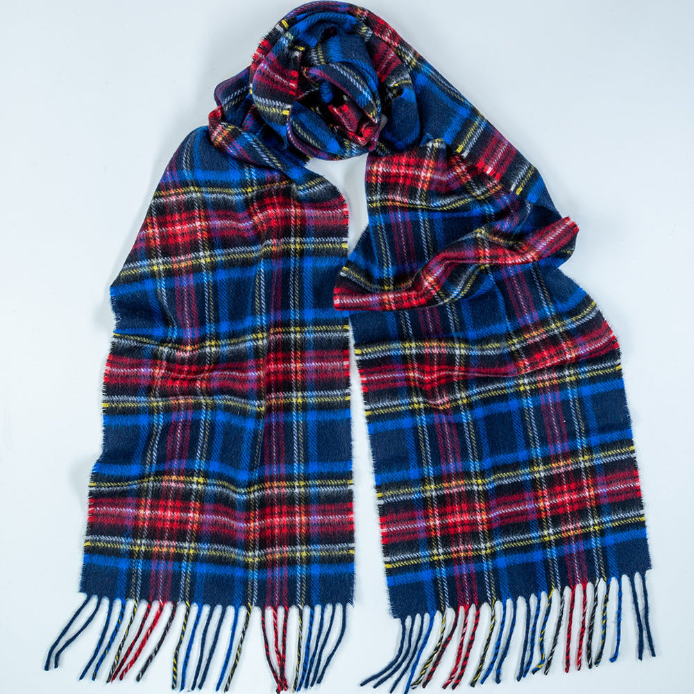 This classic Black Stewart tartan cashmere scarf is woven in Scotland from high quality pure cashmere and its tones of black, blue, green and red make it a failsafe tartan choice for those who favour a subtle look. Luxuriously soft and warm it brightens up winter outfits and makes an excellent gift.