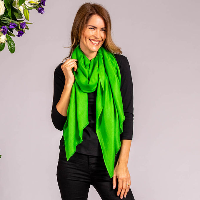 Bright and bold this intensely green cashmere and silk wrap, from our collection of vivid plains, makes a real statement. Reflecting the stunning tones of the rare Tsavorite green garnet it is crafted from a high quality blend of cashmere and silk making it the perfect year round accessory. Soft to the touch, light and warm it is generously sized and drapes effortlessly.