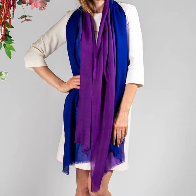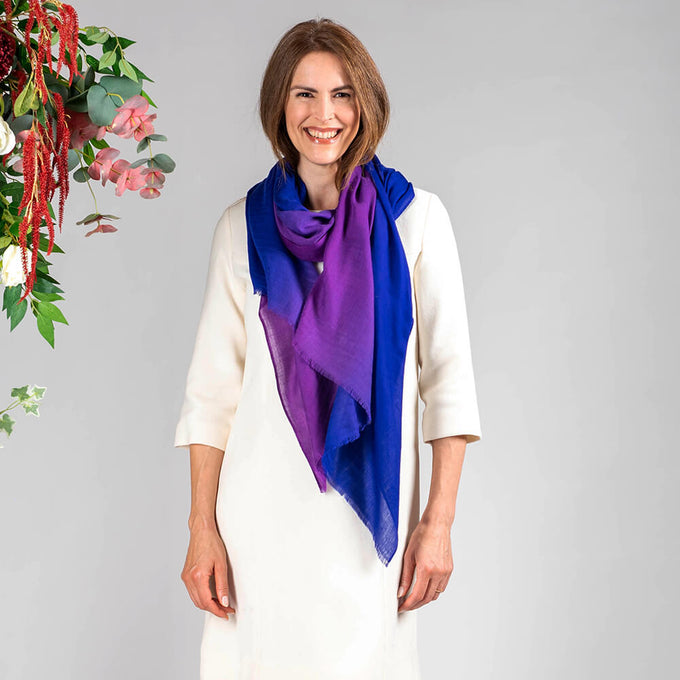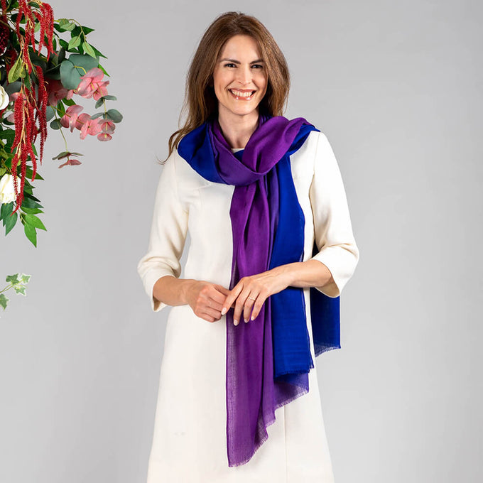 Reflecting the rich gemstone tones of deep sapphire and amethyst this indigo to violet cashmere and silk wrap is cleverly shaded with one tone blending seamlessly into the other. From our ever growing collection of popular shaded wraps it is expertly crafted from a clever blend of cashmere and silk. Soft to the touch, it is light and warm and a perfect year round wrap which drapes elegantly. Generously sized at 200 x 70cm