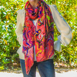 Pink Drift depicts colour in motion. A background of softly toned magenta is enlivened with statement swirls of blues, lemon and lime. Crafted from a blend of cashmere and silk it is soft, warm, lightweight and generously sized. It drapes effortlessly and is large enough to use as a shawl