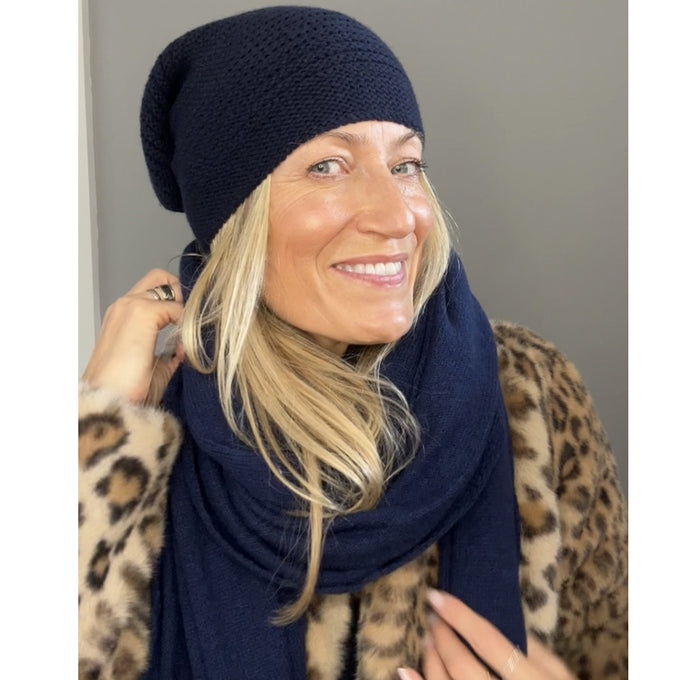 Indulge in the luxurious warmth of pure Italian cashmere with this extra wide extra long navy blue knitted cashmere scarf. Wrap it around your neck twice for a generous enveloping feel or drape it nonchalantly around the shoulders. Whichever way you wear it you will be snug and comfortable all winter long.