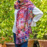 Patchwork Pinks, in tones of pink and red, shows small cameos of the original print which we have magnified to define the detail of the myriad of fabric designs in a dramatic patchwork effect. Crafted from a blend of cashmere and silk it is soft, warm, lightweight and generously sized. It drapes effortlessly and is large enough to use as a shawl