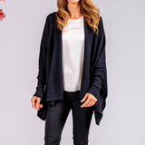 An elegant new addition to our collection of capes, coatigans and ponchos, this black sleeved cashmere cape come cardigan is a truly versatile garment which you will not want to be without. Crafted in Italy from high quality 100% cashmere it is ultra soft, deliciously warm yet light, and easy to wear. Throw it over jeans or dresses, it will take you effortlessly through from day to evening and is supremely comfortable and universally flattering. It has open sides and 20cm long sleeves.