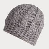 Experience luxurious warmth and softness with this dove grey cashmere beanie, new to our collection of cashmere beanies. It stands out with its unique and unusual plaited knit pattern, an intricate braid that adds texture and depth. The panels in between the braiding fan out slightly to create a light effect. Crafted in Italy from ultra soft cashmere yarn it is finished with a chunky rib knit border.