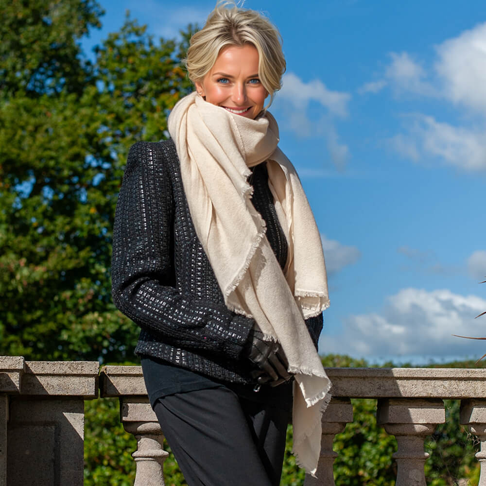 Feminine and flattering this luxurious oversized buttermilk cream pure cashmere shawl (210cm x 105cm) is fine and feather light. Crafted in a casual gauzy weave from pure cashmere it is semi sheer and drapes elegantly in soft folds. Ultra soft and light it is cool in summer worn as a wrap and warm in winter tied as a luxurious scarf. Perfect for travelling too, it packs neatly away. Short eyelash fringing gives it a chic finish.