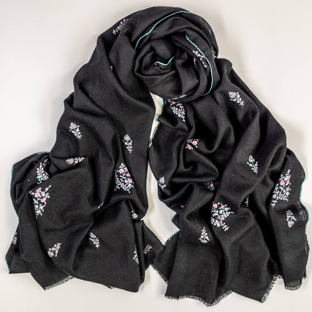 Hand Embroidered Pashmina Cashmere Shawl - Black & Pastel Detail