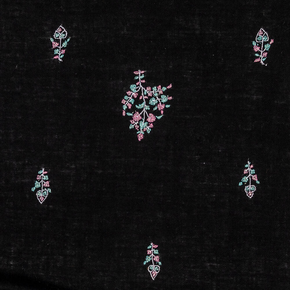 Blending traditional artistry with contemporary design this black pashmina shawl is exquisitely embroidered with pale pink and pale green thread in a delicate floral design through the length of the shawl, the floral sprays inspired by the beauty of the Kashmir region. It is edged with finely stitched embroidery in green.