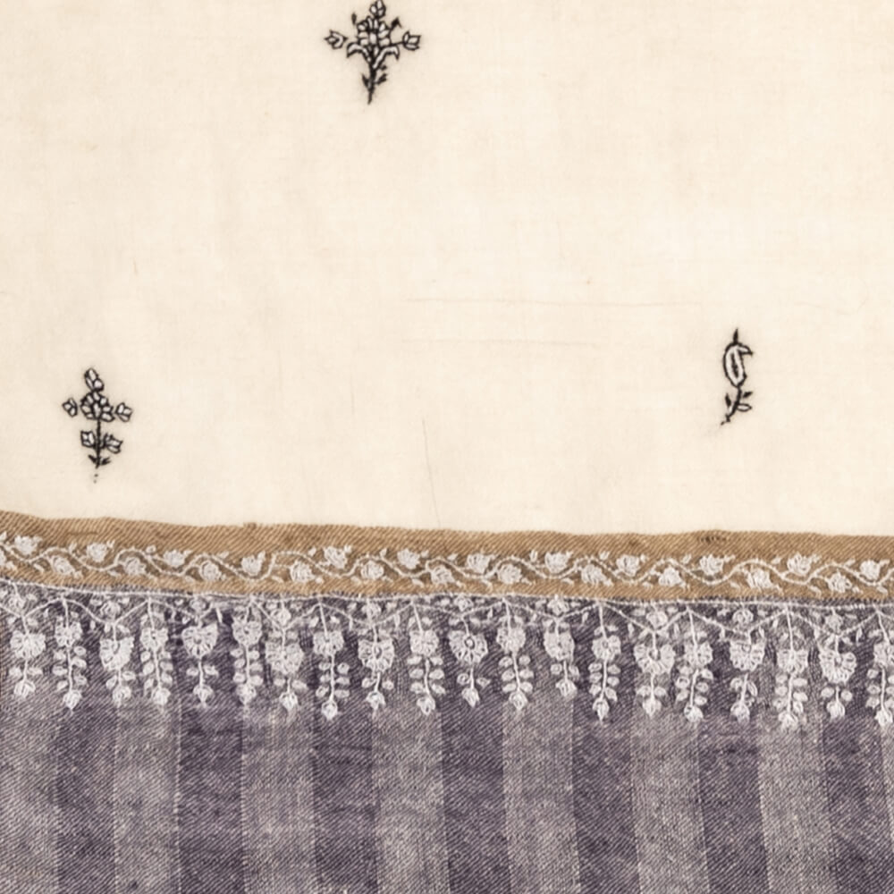 The natural tone of the shawl is peppered with pretty motifs and contrasts sympathetically with the grey striped border which is delicately embroidered with a fine floral design. The long edges, embroidered in white thread, add a perfect finishing touch.