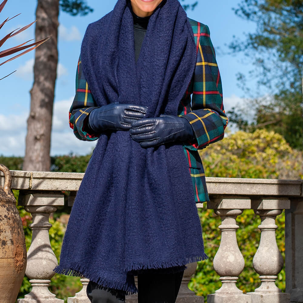 Indulge in the luxury of pure cashmere and envelop yourself in the gentle warmth and supreme softness of this beautiful deep navy blue cashmere shawl. Woven in Kashmir from premium cashmere yarn in an interesting basket weave design which gives it a natural, understated texture it is generously sized and finished with 4cm eyelash fringing. This is a wrap you won’t want to be without.