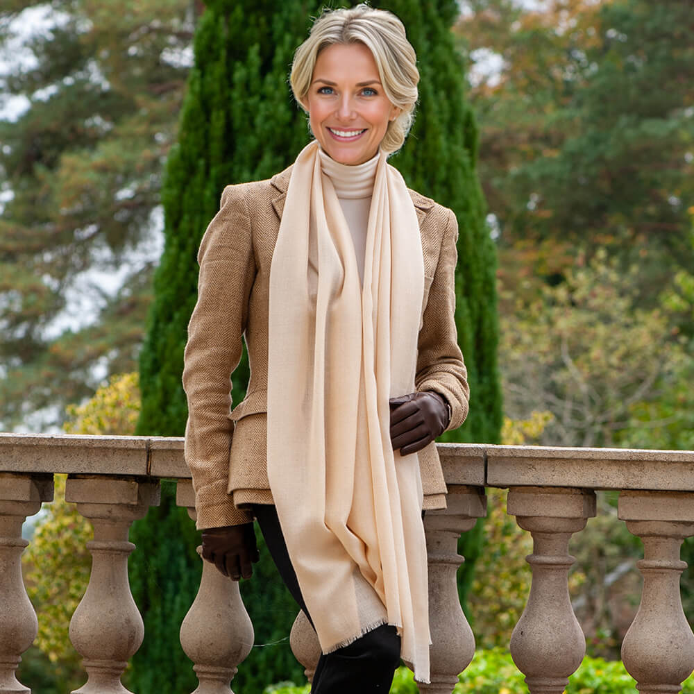The pearl, June's Birthstone, has soft, lustrous tones that echo timeless purity, symbolising, innocence wisdom and integrity all qualities reflected in the soft hue of this pearl cashmere and silk wrap. Crafted from a luxurious blend of cashmere and silk, it is soft, light but warm and offers a fluid drape with a subtle sheen. Understated and chic  this wrap embodies the quiet grace of June’s gem.
