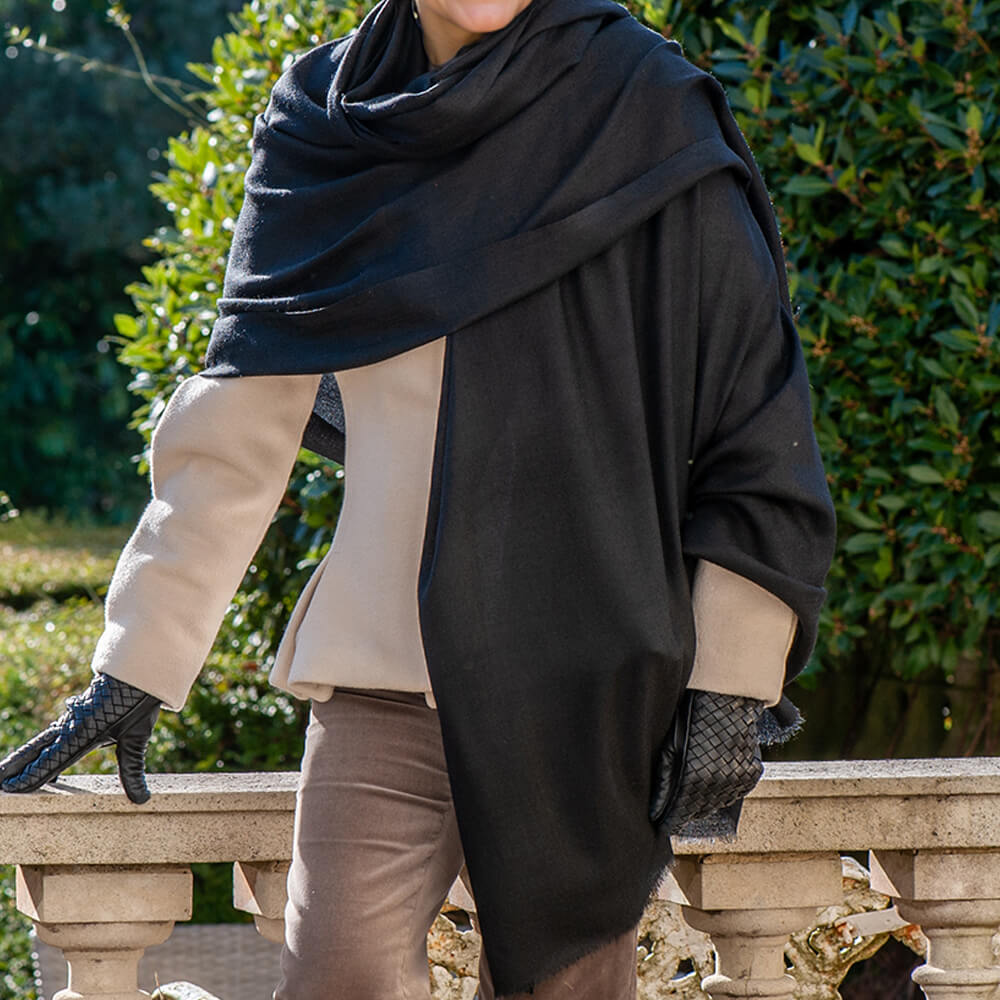 Soft to the touch, light to wear and supremely warm, this black cashmere and silk wrap is a really versatile and luxurious accessory. It is perfect for day or evening, smart or casual. It also makes a welcome, failsafe gift. Crafted from a pure cashmere and silk blend it is finely woven in a classic diamond weave and finished with short eyelash fringing. Give a little luxury.
