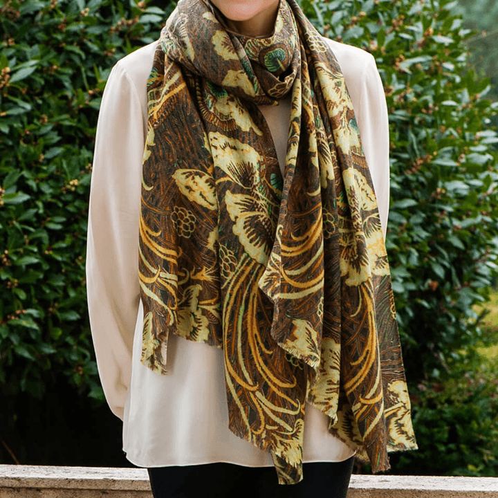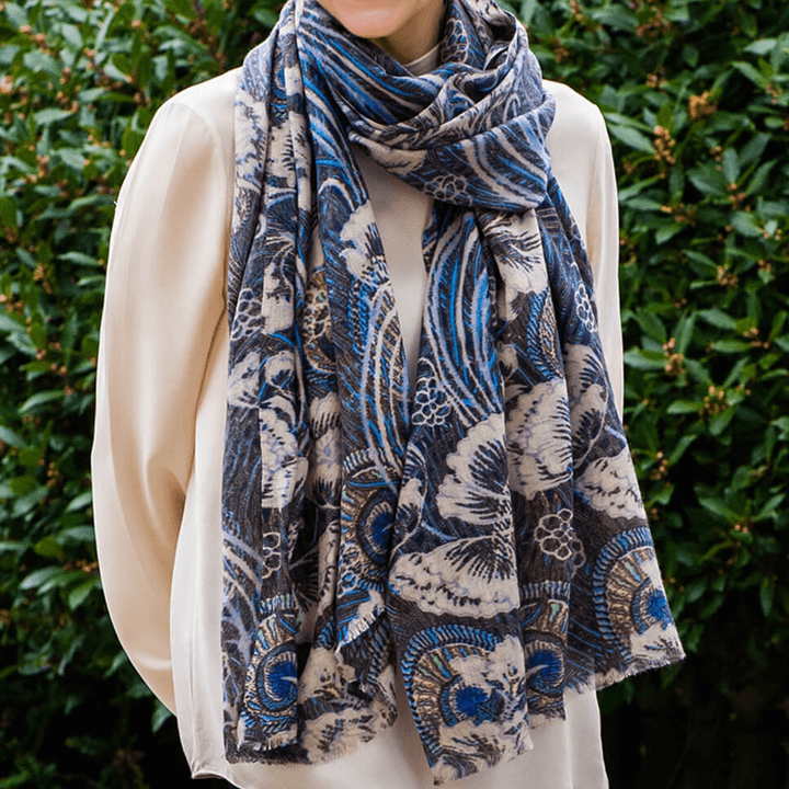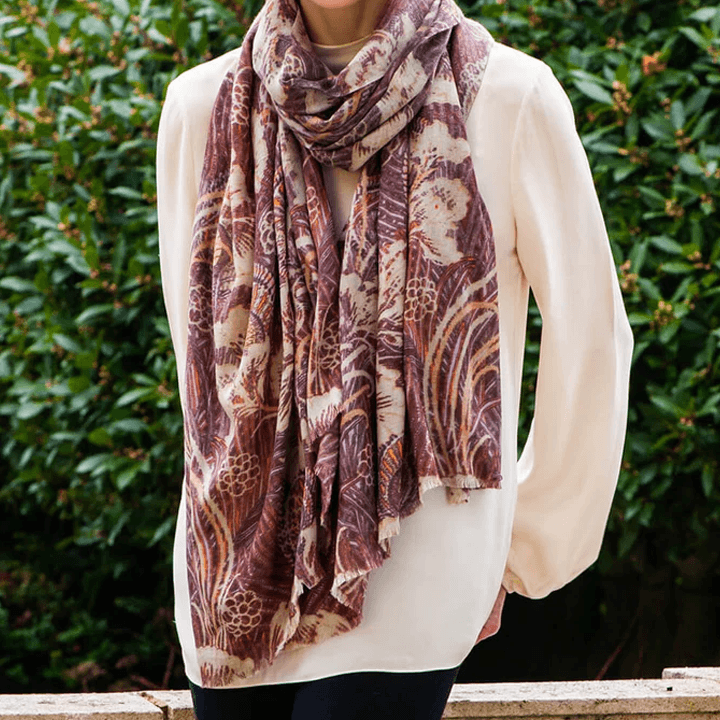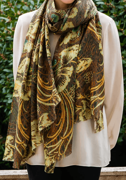 Light and dark greens, highlighted with soft browns and touches of aqua flow together in sweeping swathes. Crafted from a rich blend of cashmere and silk it is soft, warm and lightweight. It is generously sized and drapes effortlessly.