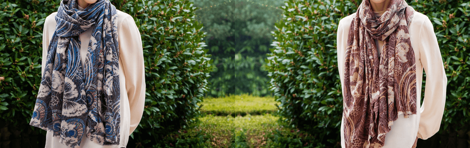 The result is a design of layered beauty and understated elegance, now translated into three timeless cashmere and silk wraps in Green, Blue and Taupe.