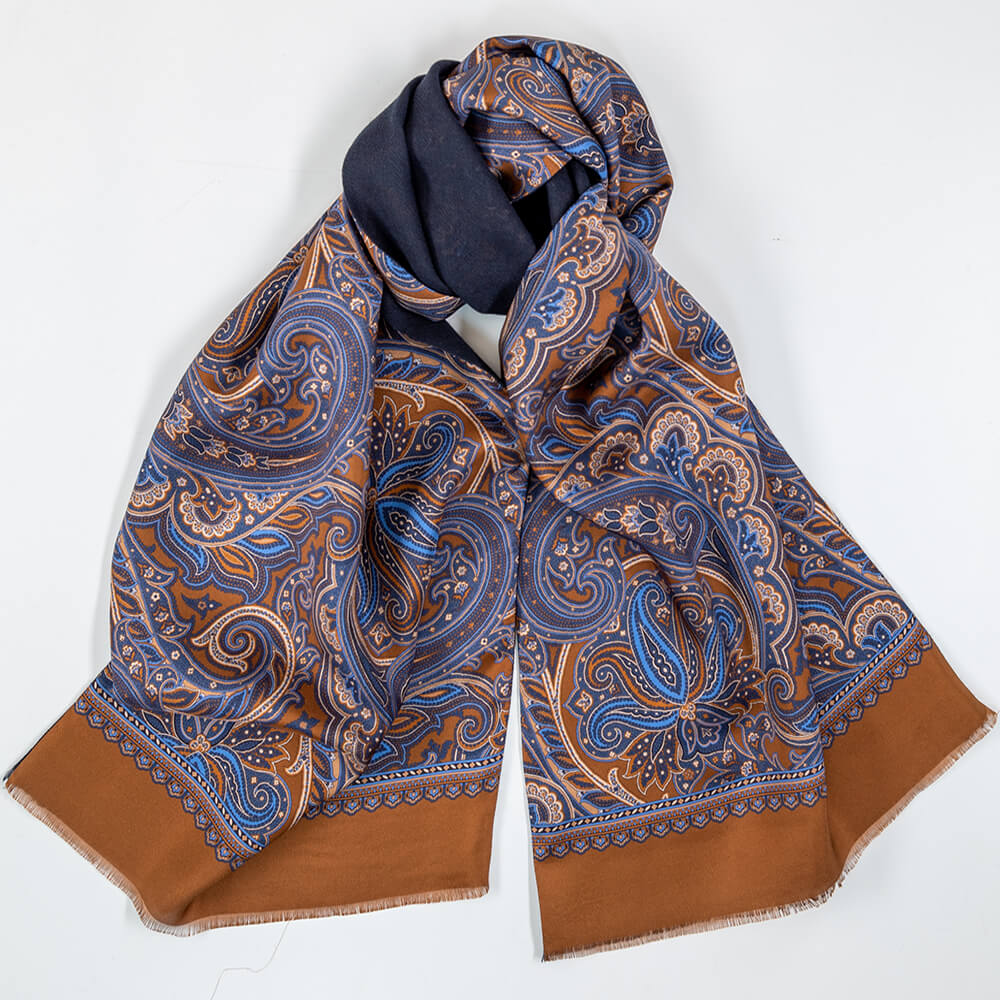 A striking blend of amber and blue tones defines this Italian handmade paisley scarf. Expertly crafted, it features an intricate paisley design that balances warm bronze hues with cool sapphire accents on a rich chocolate brown background — a sophisticated expression of timeless elegance.