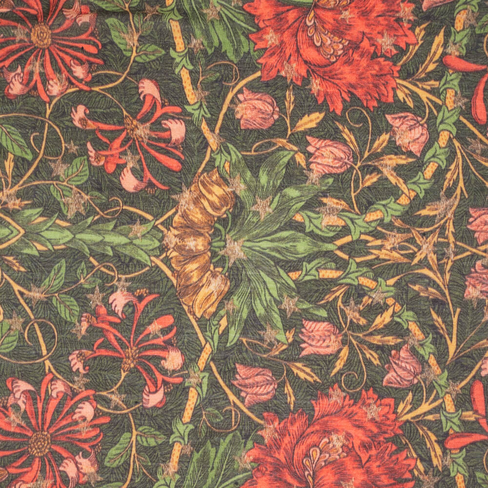 Deep coral florals and lush green foliage are layered over a forest green background, evoking a rich, woodland-inspired palette. The warmth of the coral contrasts beautifully with the depth of green, enhancing the organic flow of foliage and honeysuckle. Crafted from a rich blend of cashmere and silk it is soft, warm and lightweight. It is generously sized and drapes effortlessly.